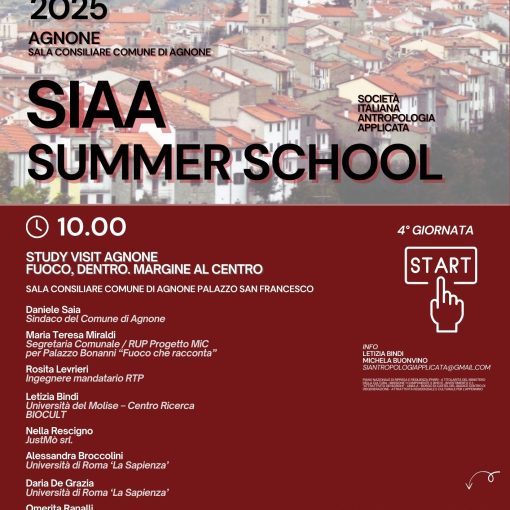 Pubblicato 30 Settembre 2025 SOCIETÁ ITALIANA di ANTROPOLOGIA APPLICATA (SIAA) SCUOLA ESTIVA di RI_GENER_AZIONE TERRITORIALE Il 17 settembre alle ore 17.30 presso Castel del Giudice in Molise si inaugura la II Summer School della SIAA – Scuola […]