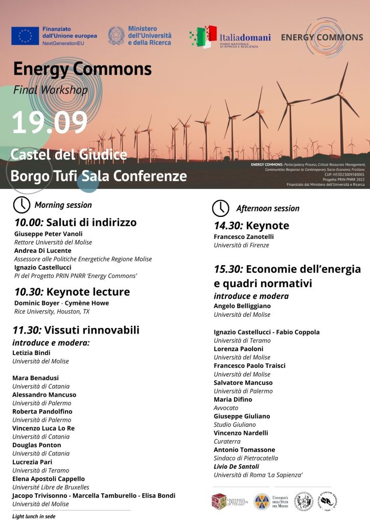 Con i saluti istituzionali del Rettore dell’Ateneo molisano, Giuseppe Peter Vanoli, dell’Assessore regionale alle politiche energetiche, Andrea Di Lucente e del Coordinatore nazionale del PRIN PNRR, Ignazio Castellucci, il workshop verrà introdotto dalla keynote lecture di Dominic Boyer e Cymène Howe della Rice University di Houston, Texas, antropologi da anni impegnati in ricerche sul valore sociale e culturale delle energie nelle comunità.