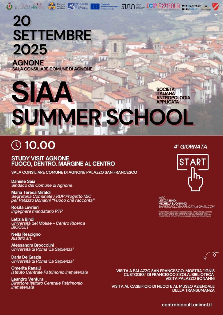 Introdotto dai saluti istituzionali del Sindaco e Presidente della Provincia Daniele Saia, l’incontro mira a introdurre la Study visit alla città che è stata finalista nella selezione a Capitale della Cultura 2026 e alle sue diverse attività produttive, associative e cooperative e ai suoi diversi luoghi di interesse culturale, il dibattito si articolerà tra le relazioni di Maria Teresa Miraldi, Segretaria Comunale e RUP del Progetto Ministeriale di allestimento di “IGNIS. Museo del fuoco – Agnone”, di letizia bindi, coordinatrice della Summer School e coinvolta nella elaborazione del concept del Museo di Palazzo Bonanni  a Capitale della Cultura 2026, di Nella Rescigno della JustMò srl. coinvolta nella preparazione dei contenuti e dell’allestimento del museo e di Rosita Levrieri che nel quadro del Museo cura gli aspetti logistici e strutturali. Accanto a questi interventi interni al caso di studio, quelli di antropologhe esperte di patrimoni immateriali e di antropologia museali: Alessandra Broccolini, Daria De Grazia, Omerita Ranalli e il Direttore dell’Istituto Centrale per il Patrimonio Immateriale, Leandro Ventura. La giornata proseguirà con la visita a Palazzo San Francesco, alla mostra fotografica “Ignis Custodes” di Francesco Zizola curata da Antonella Struzzolino dell’Ass. Il Cavaliere di San Biase e da letizia bindi e al caseificio DI Nucci e al museo aziendale della transumanza. Al rientro i corsisti della Scuola esitva di Ri_gener_azione avranno modo di confrontarsi con i formatori e i partecipanti al Campus ReStart-Up della Fondazione Garrone per lo sviluppo dell’imprenditoria nelle aree appenniniche.